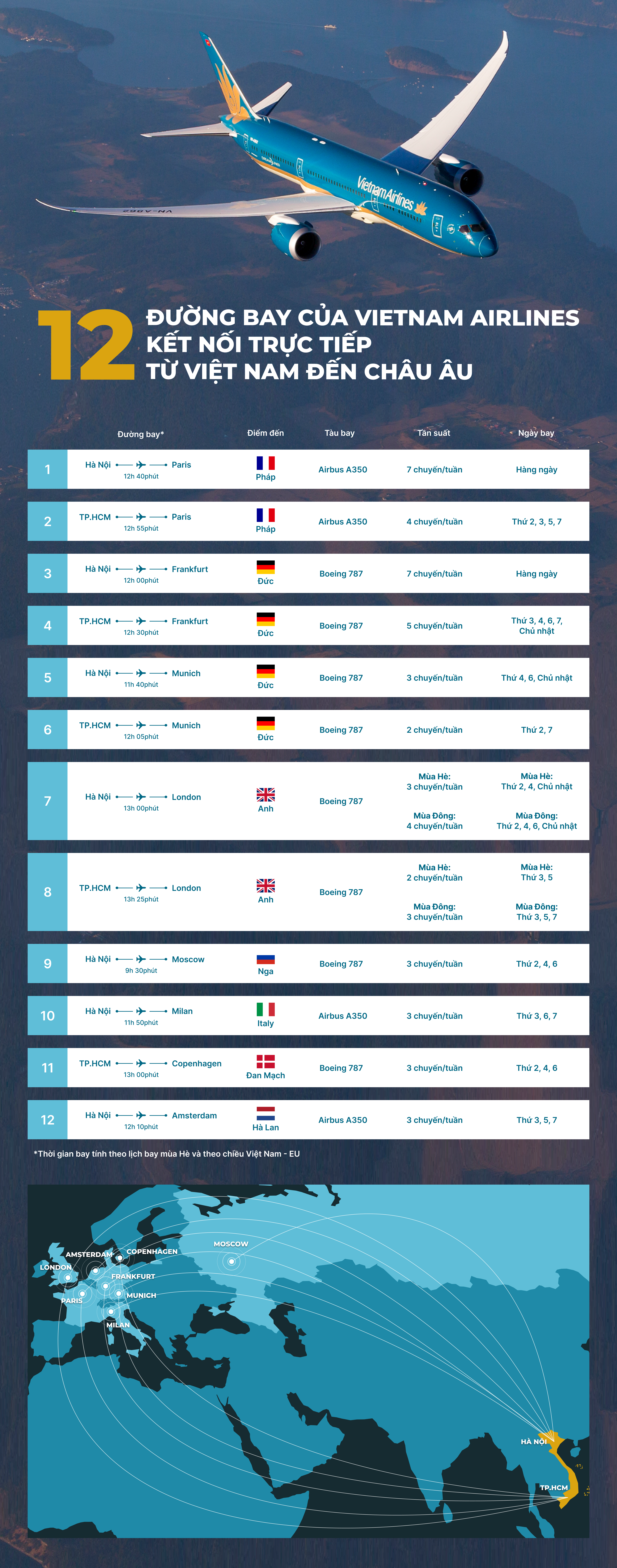 Từ Hà Nội và TP.HCM, Vietnam Airlines hiện khai thác 12 đường bay tới Paris, Frankfurt, Munich, London, Moscow, Milan, Copenhagen và Amsterdam bằng đội tàu bay thân rộng Airbus A350 và Boeing 787 hiện đại. Mạng bay này tạo nền tảng vững chắc để Hãng mở rộng thị trường, nâng cao năng lực cạnh tranh và chất lượng dịch vụ với tiêu chuẩn quốc tế.