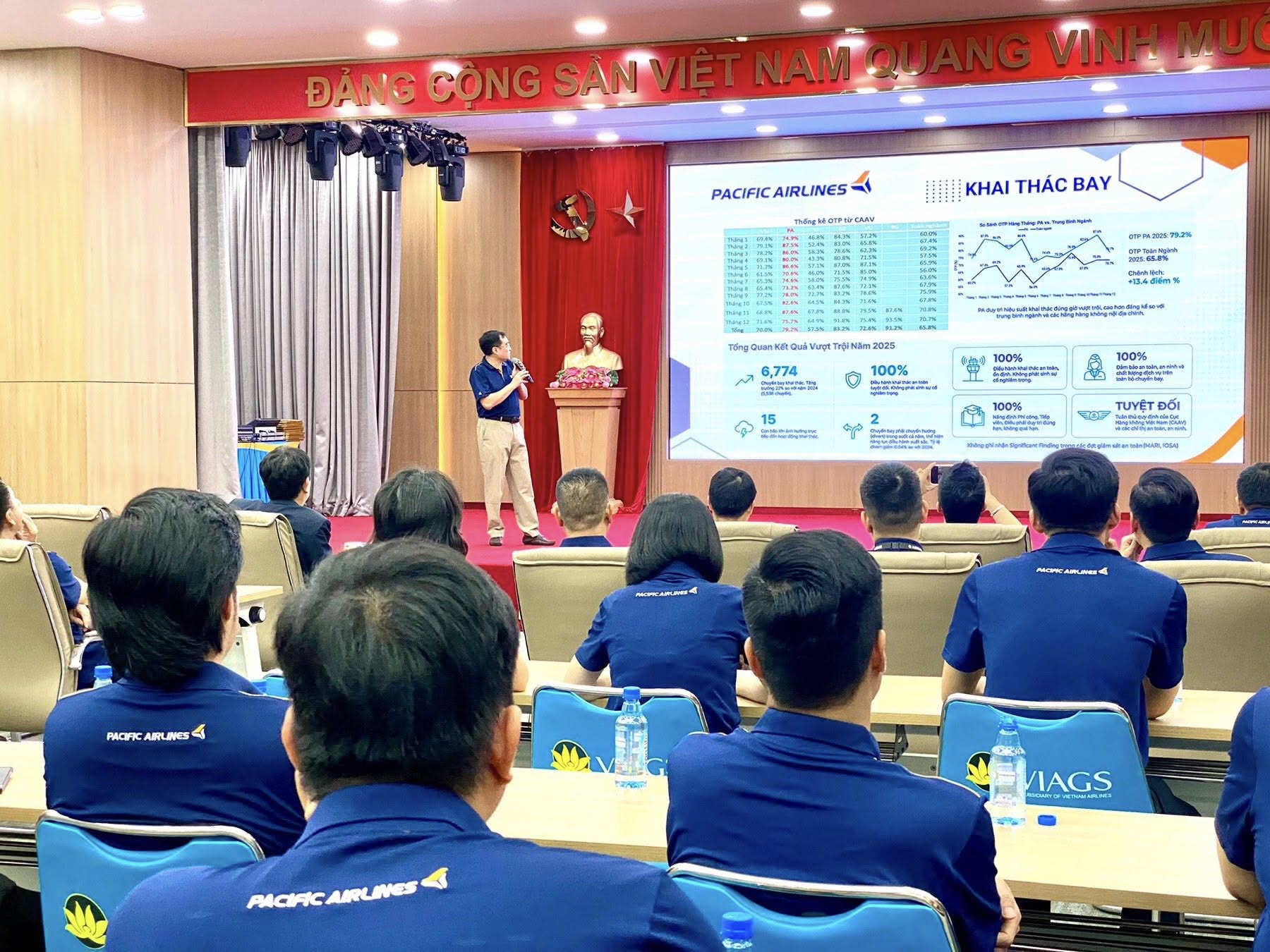 Tại Hội nghị, các báo cáo chuyên đề đã tập trung làm rõ tình hình khai thác bay, công tác bảo đảm an toàn, hiệu quả sản xuất kinh doanh và nỗ lực nâng cao chất lượng dịch vụ. Những kết quả đạt được trong năm qua là minh chứng cho sự chỉ đạo sát sao của Ban Lãnh đạo, tinh thần đoàn kết, kỷ luật và trách nhiệm của tập thể cán bộ, người lao động Pacific Airlines, thành viên Vietnam Airlines Group.