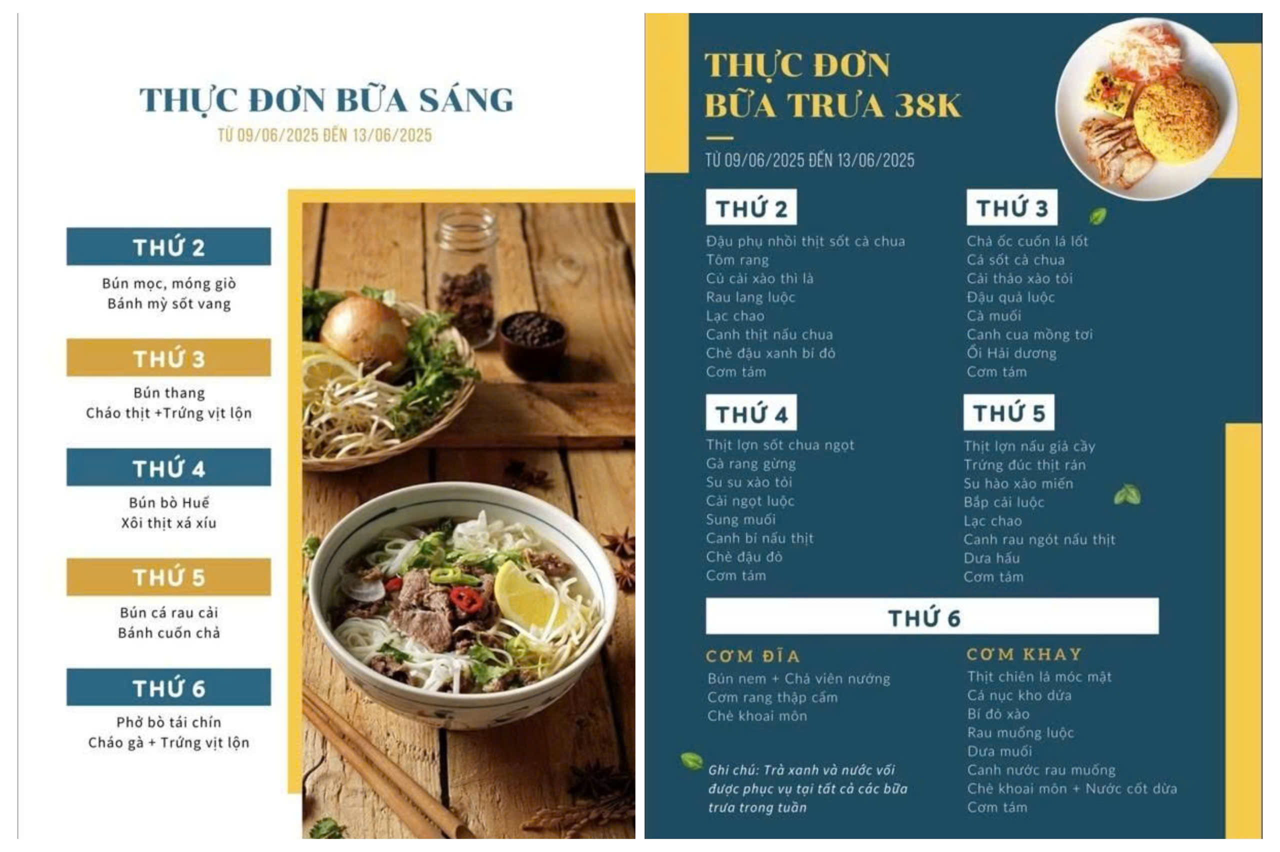 Thực đơn được xây dựng theo tuần, niêm yết công khai để cán bộ nhân viên theo dõi và lựa chọn. Tuần từ ngày 9/6 đến 13/6, với bữa sáng, nhà ăn phục vụ nhiều món truyền thống thay đổi theo ngày như bún mọc, cháo thịt, bánh cuốn chả, bún bò Huế hay bánh mì sốt vang.