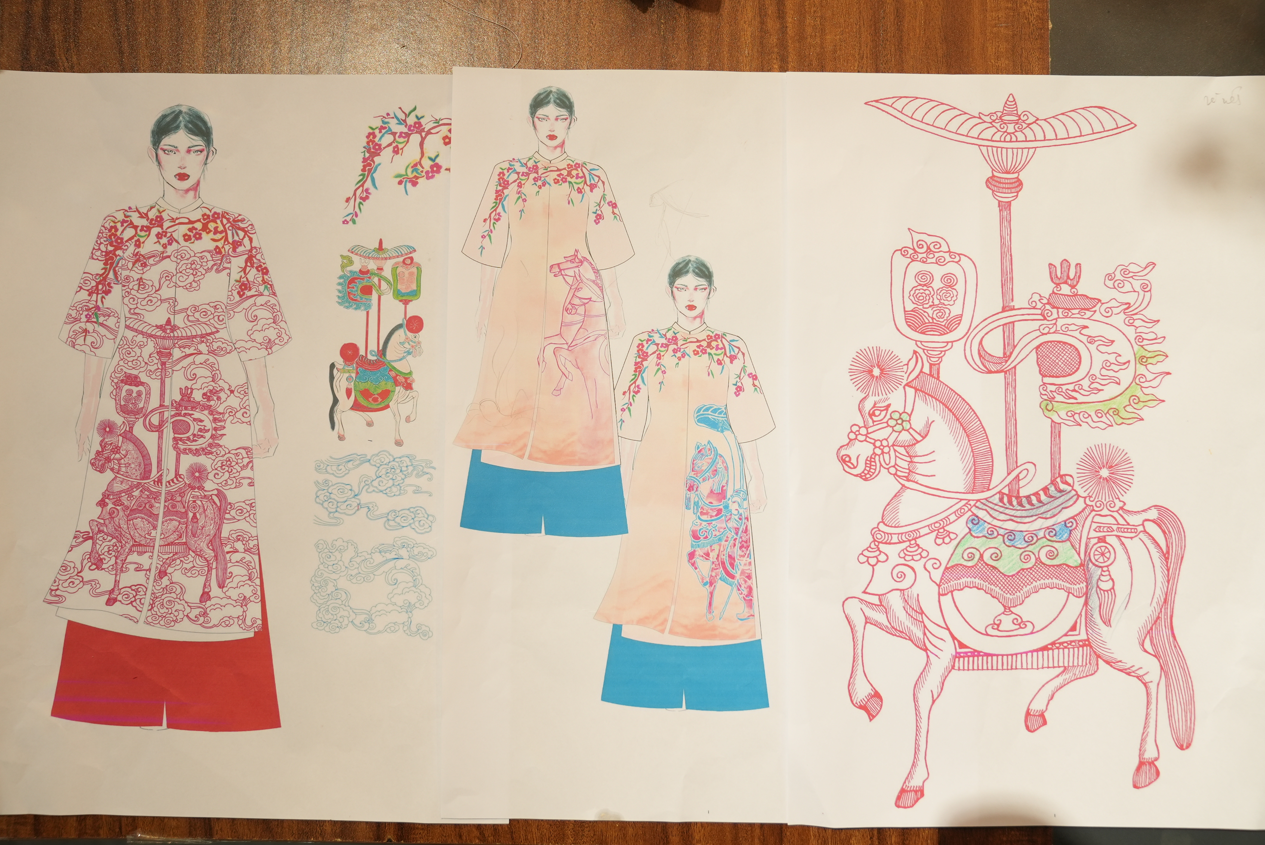 Các thiết kế trong bộ sưu tập là sự kết hợp hài hòa giữa những biểu tượng mùa xuân và chiều sâu văn hóa truyền thống. Cành đào khoe sắc, đóa sen hồng tỏa hương được điểm xuyết cùng hoa văn chạm khắc rồng thời Lê, đường nét mây và sóng nước uốn lượn, tạo nên tổng thể vừa mềm mại, uyển chuyển vừa trang trọng, mạnh mẽ. Đặc biệt, hình tượng “Ngựa phi sen nở” trở thành thông điệp xuyên suốt: sức mạnh và tốc độ của ngựa hòa cùng vẻ đẹp thanh khiết, vươn lên của sen, đại diện cho Tài lộc, Danh vọng, Phẩm giá trong văn hóa Á Đông.