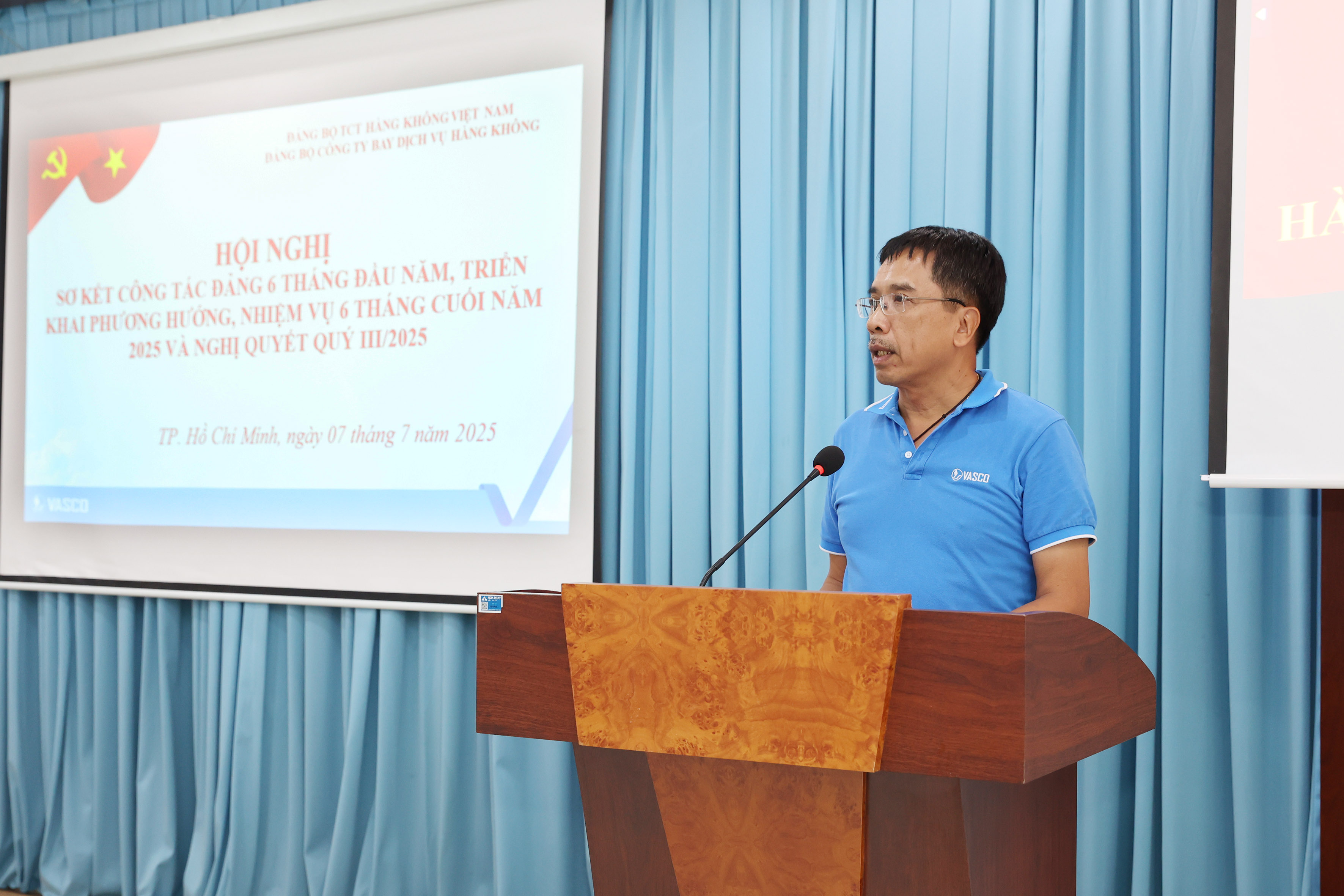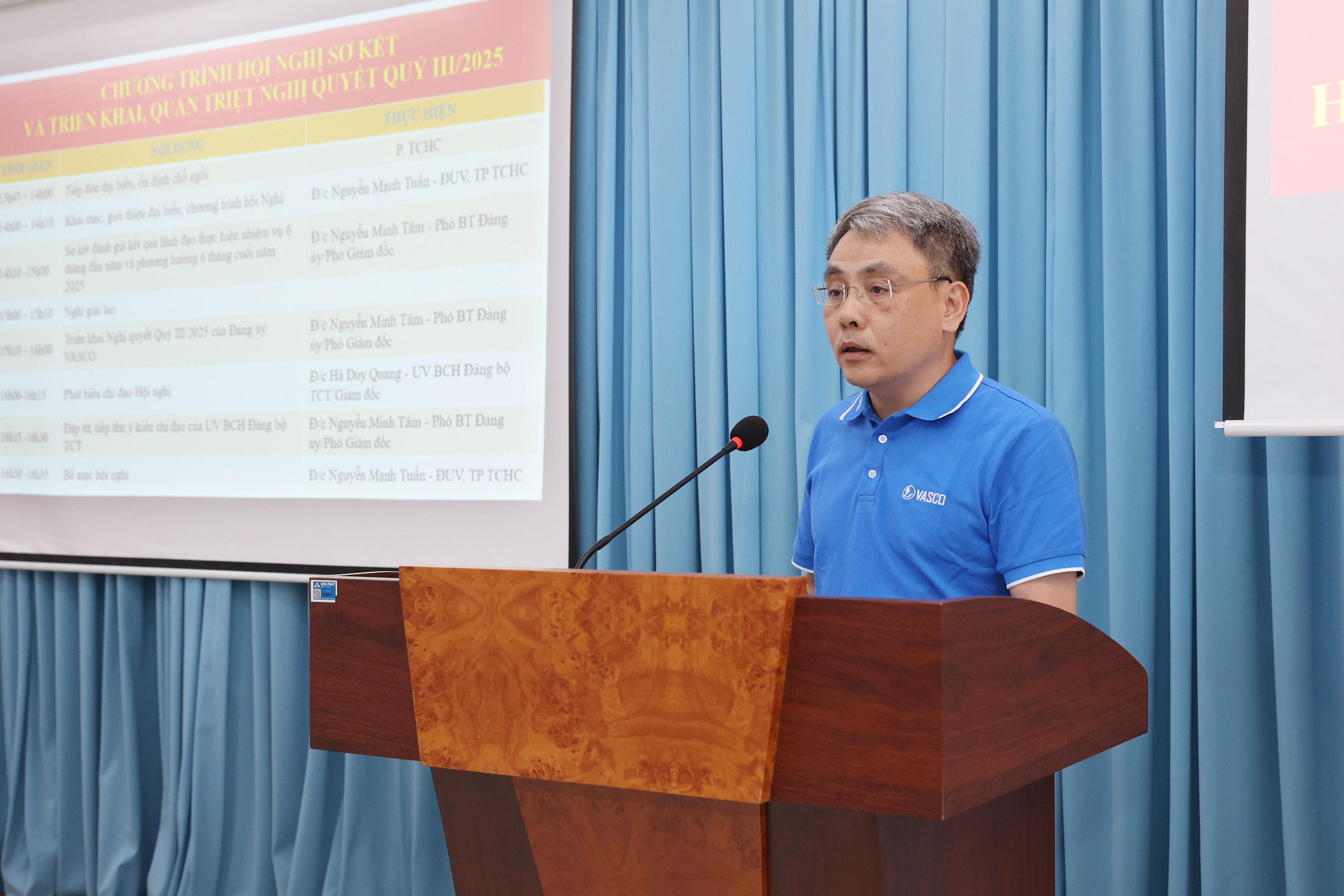 Tiếp đó, Hội nghị đã tập trung quán triệt Nghị quyết của Đảng ủy VASCO số 35-NQ/ĐU ngày 19/6/2025 về lãnh đạo thực hiện nhiệm vụ quý III/2025, đây là kim chỉ nam quan trọng cho các hoạt động của Đảng bộ trong thời gian tới. Hội nghị cũng đã vinh dự được lắng nghe phát biểu chỉ đạo của Đồng chí Hà Duy Quang – Giám đốc VASCO.