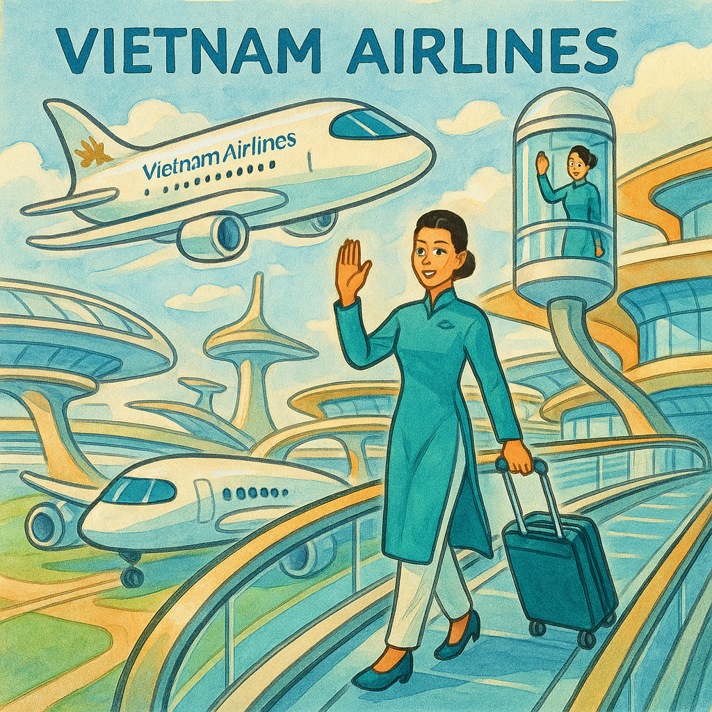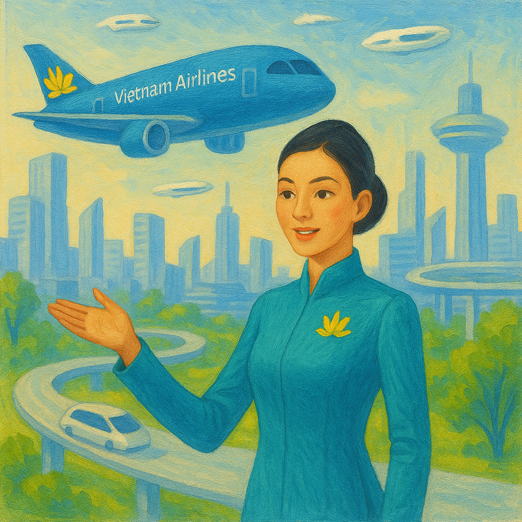 Ý nghĩa: Hình ảnh tiếp viên áo dài duyên dáng bên thành phố tương lai hiện đại.