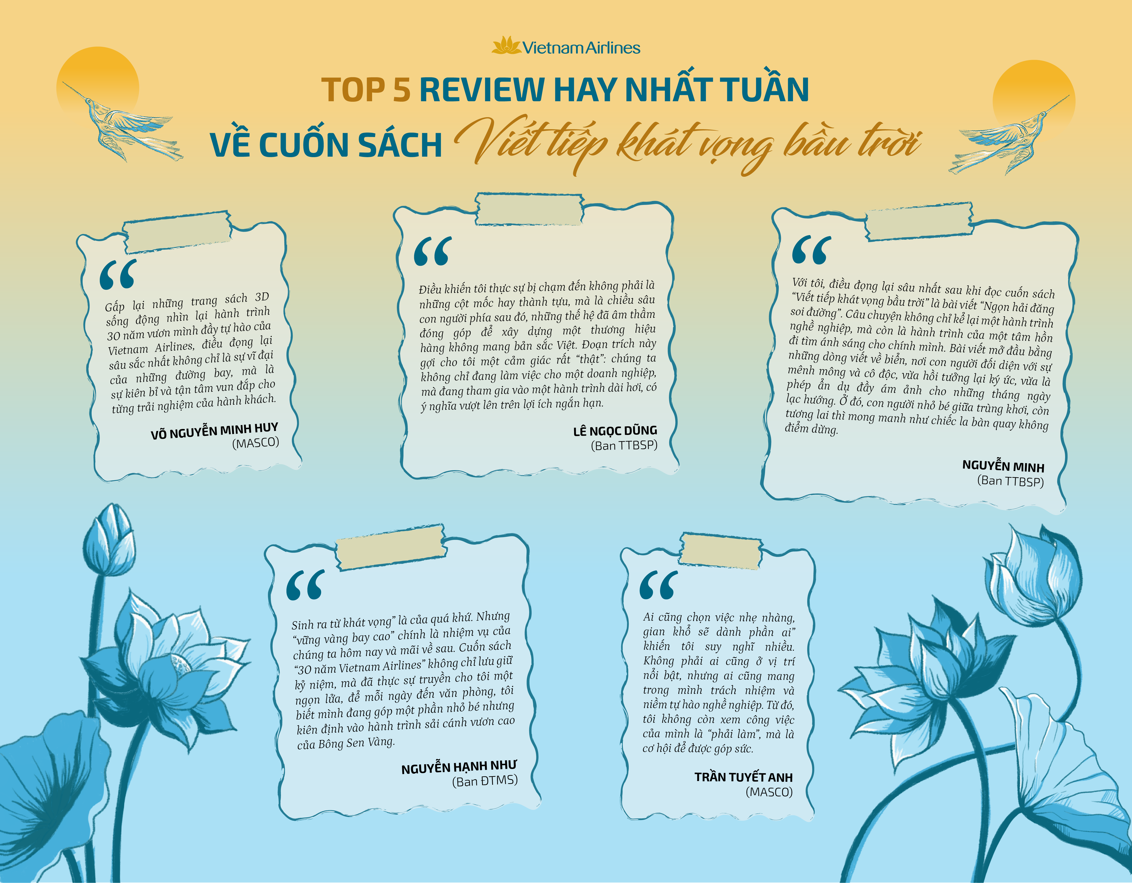 Top 5 review xuất sắc của tuần sẽ nhận được phần quà từ Ban Tổ chức, bao gồm cuốn sách “Viết tiếp khát vọng bầu trời” và mascot bông. Anh/chị vui lòng liên hệ đầu mối: Ms. Thu Phương – Ban Truyền thông, SĐT: 0855.070.699 để được hướng dẫn nhận quà.