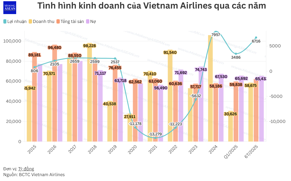 Lũy kế nửa đầu năm, Vietnam Airlines đạt doanh thu khoảng 58.675 tỷ đồng, tăng 10,6% so với cùng kỳ năm 2024 (YoY), lợi nhuận trước thuế đạt 6.716 tỷ đồng, tăng 19% YoY, theo báo cáo soát xét bán niên của HVN.