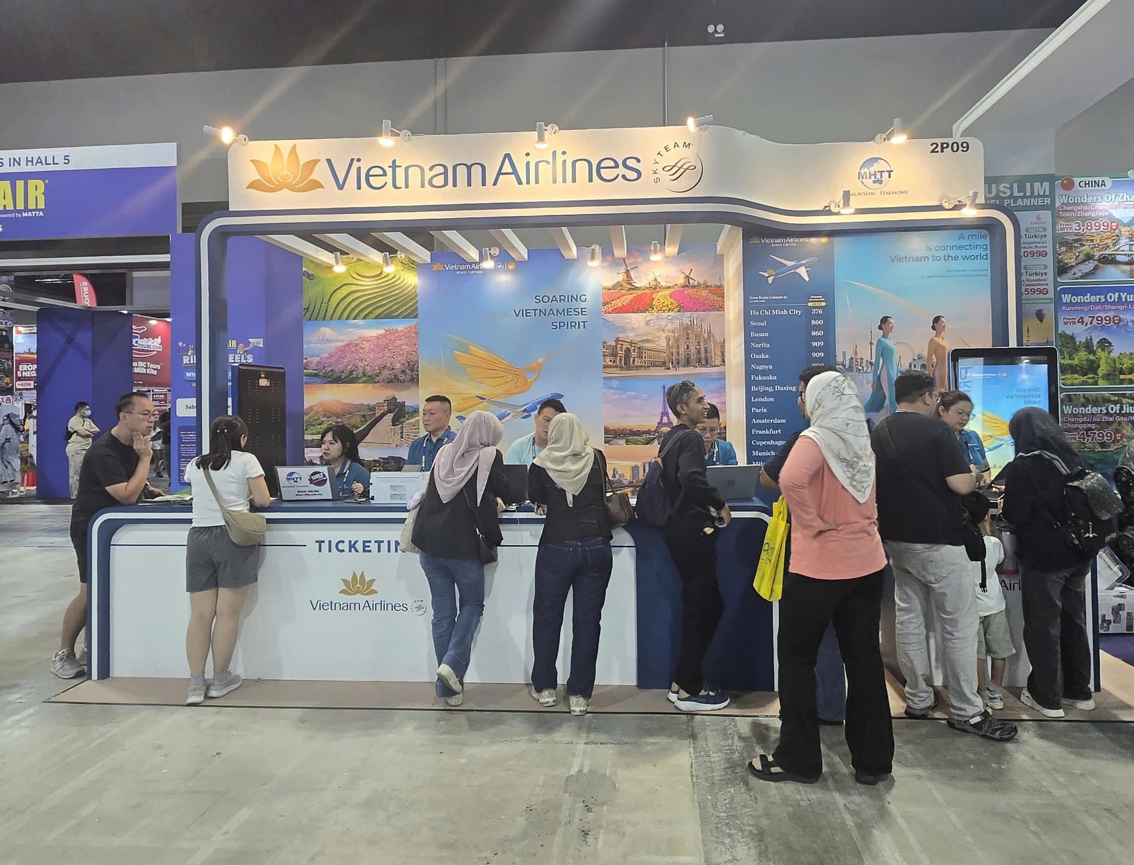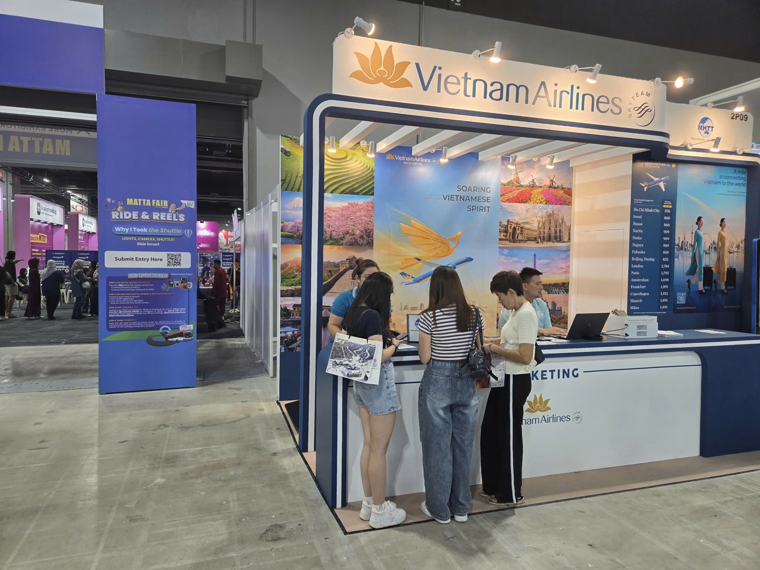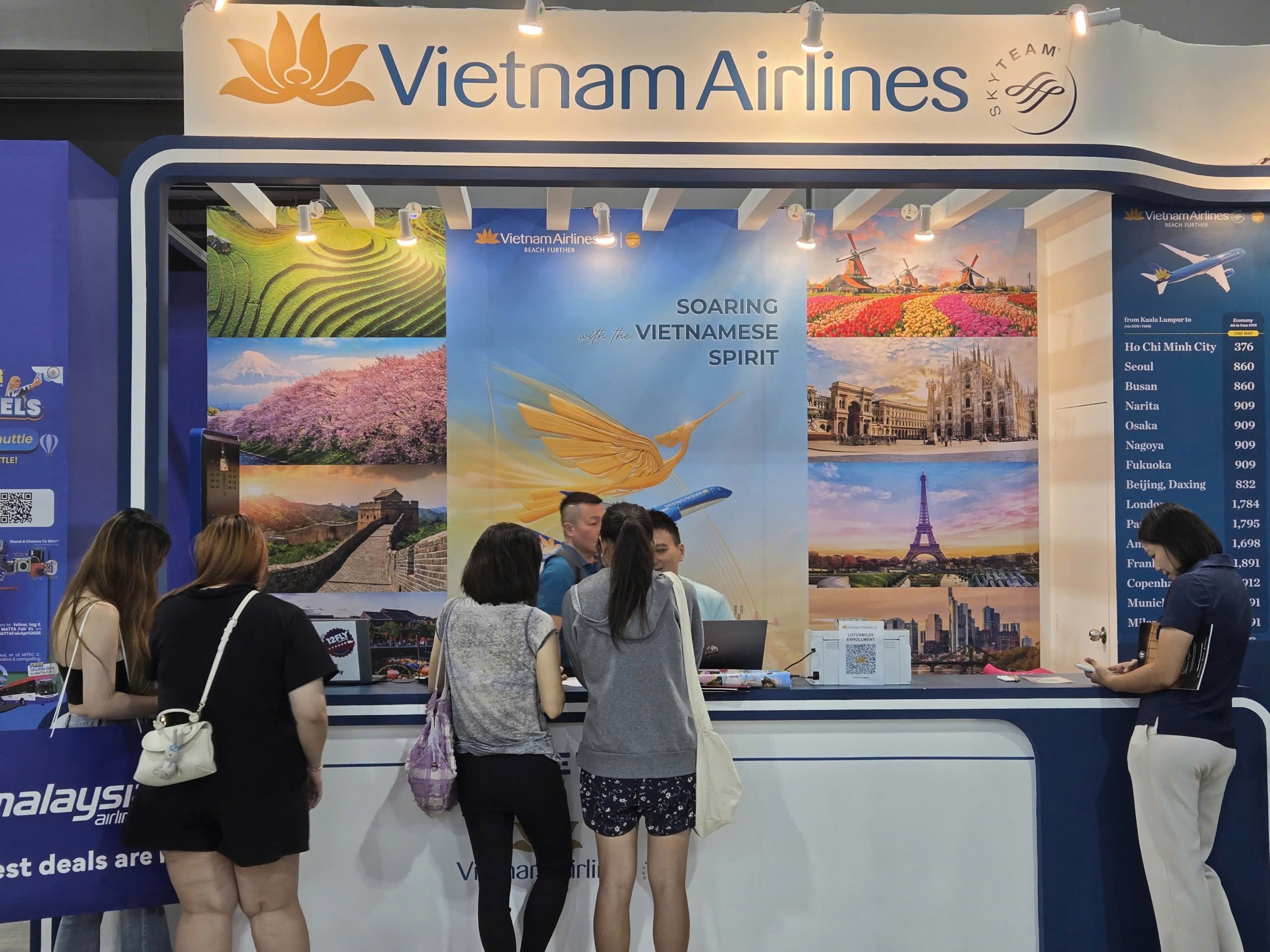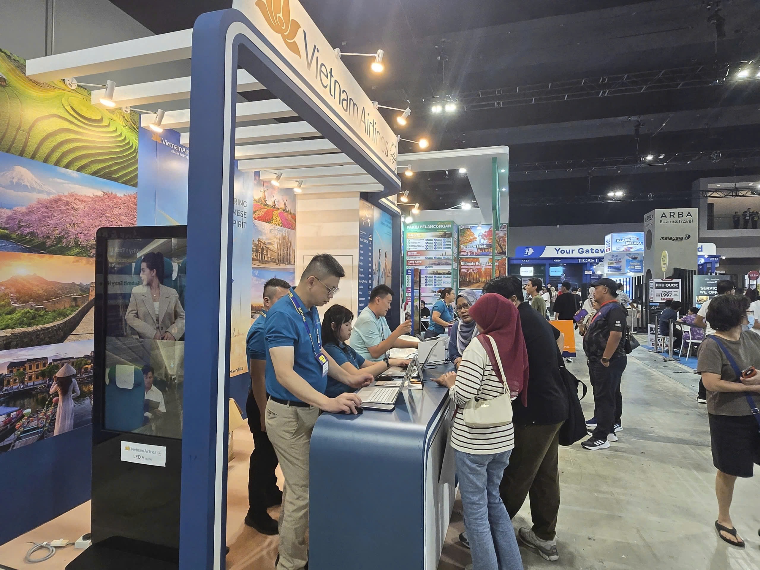 MATTA Fair năm nay thu hút hàng nghìn lượt khách tham quan cùng sự góp mặt của các cơ quan xúc tiến, hãng hàng không và các đơn vị lữ hành hàng đầu thế giới. Trong không khí sôi động đó, gian hàng của Vietnam Airlines nổi bật với thiết kế tinh tế, mang đậm dấu ấn bản sắc Việt với biểu tượng Hoa sen vàng và hình ảnh tà áo dài truyền thống, tạo nên một điểm chạm văn hóa đặc sắc giữa lòng Kuala Lumpur.