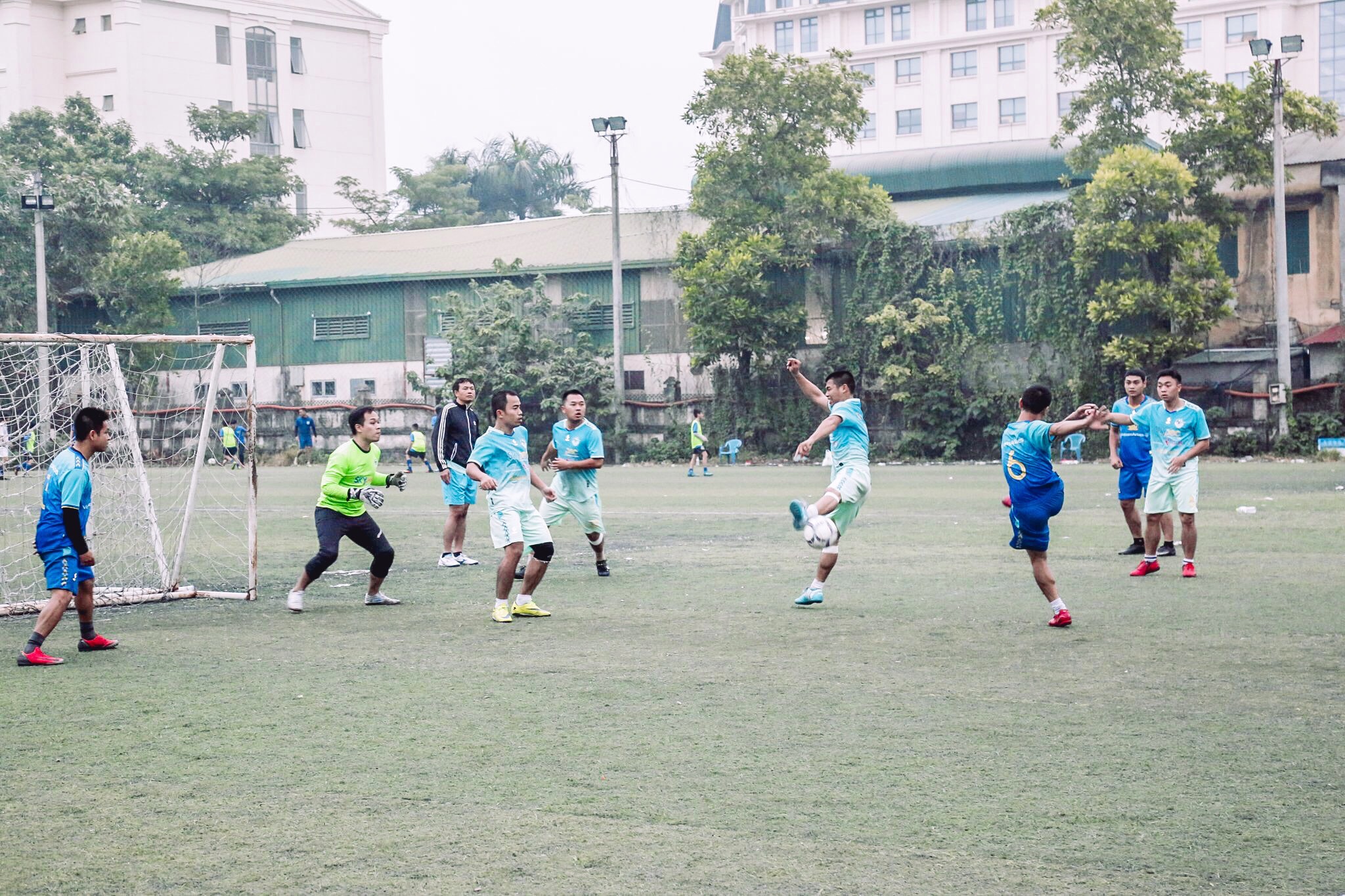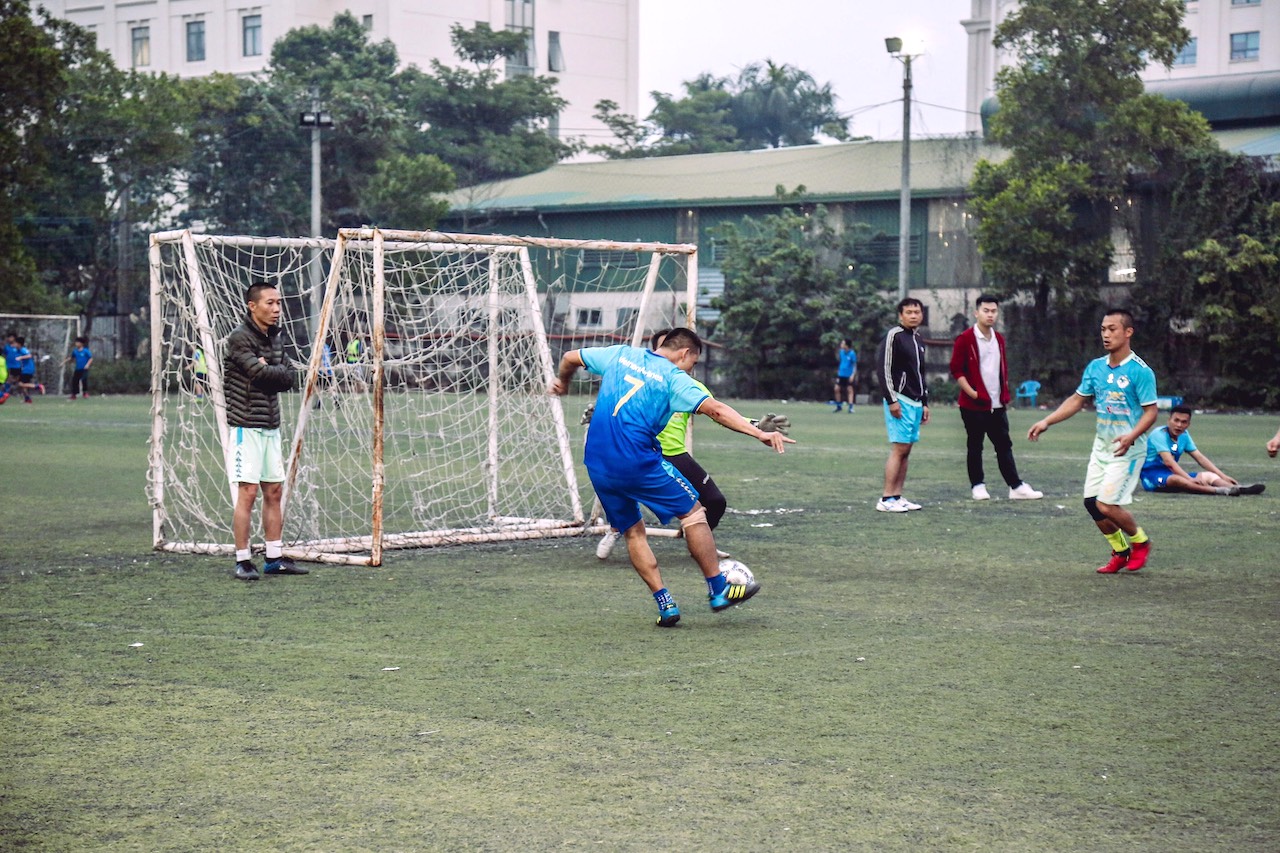 Cú sút đầy uy lực của cầu thủ Nguyễn Tiến Khải (Số 8) đội VNA. (Ảnh: ĐTN).