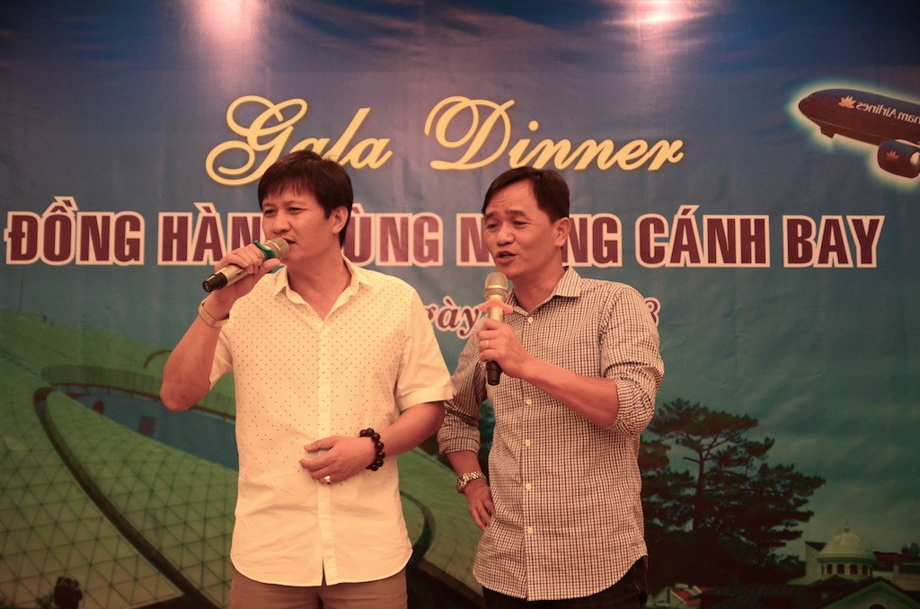 Cơ trưởng A350 Nguyễn Hải Anh và Trương Việt Dũng trong tiết mục văn nghệ Đồng hành cùng những cánh bay.