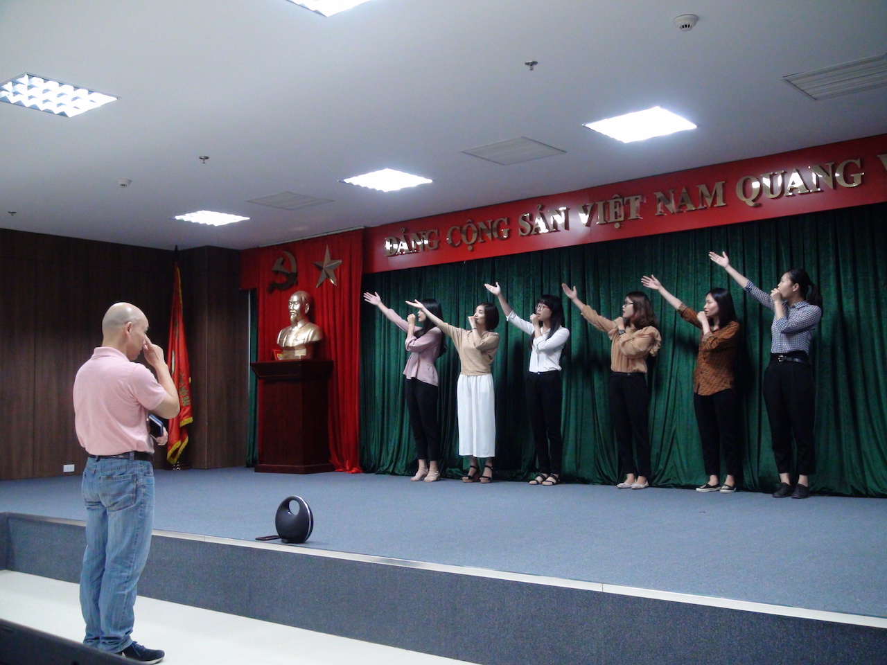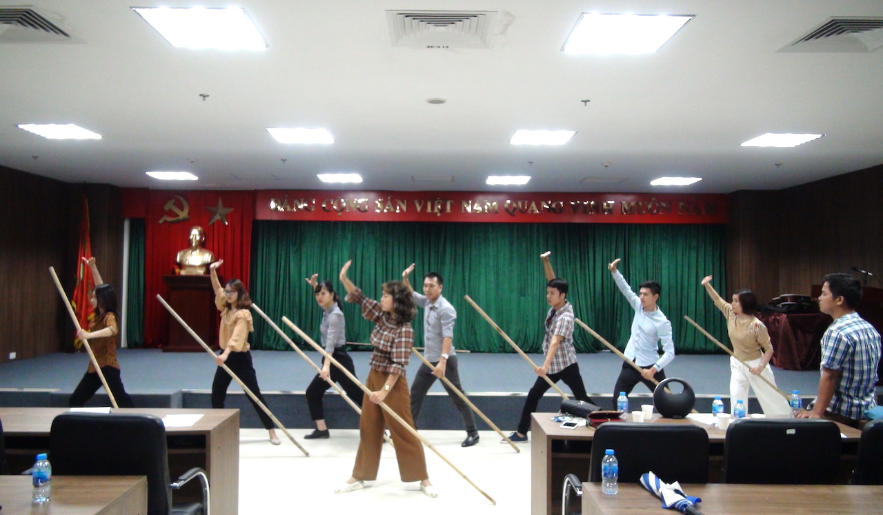 Các thành viên Đội văn nghệ NCS tập luyện cùng huấn luyện viên. (Ảnh: NCS).