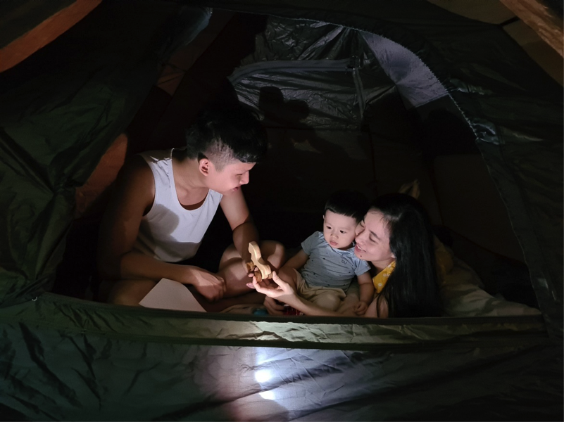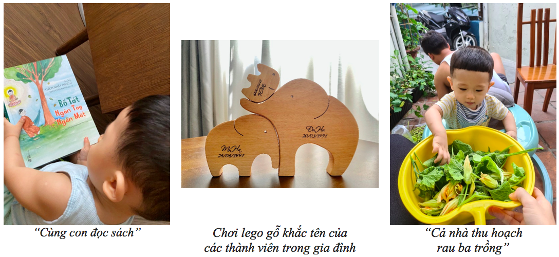 Bạn sẽ không thấy chán khi ở nhà với con vì các bạn nhỏ sẽ có nhiều trò mà người lớn không hình dung được, lúc nào bạn ấy cũng khiến vợ chồng tớ “mắt chữ A, miệng chữ O”. Niềm hạnh phúc không thể tả là thấy sự phát triển của con nên vợ chồng tớ cùng tạo ra nhiều trò chơi, không gian để con được học hỏi, phát triển: cắm trại tại nhà thay vì phải đi ra ngoài, đọc sách cho con, cùng con làm vườn rau, gọi điện video qua mạng để hỏi thăm ông bà… và làm từ thiện giúp đỡ các hoàn cảnh khó khăn.